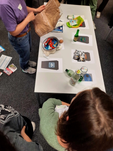 • Abfälle vermeiden: Littering sollte nicht sein! In einem Sketch wurde das Verschmutzen des öffentlichen Raumes durch die Teilnehmer*innen dargestellt. Zudem wurde der Lebensweg von Produkten sowie das Prinzip der Kreislaufwirtschaft erläutert. Mit einem Mülltrennungsspiel wurde eine praktische Umsetzung der „Abfallsortierung“ in zwei Gruppen spielerisch aufgearbeitet.