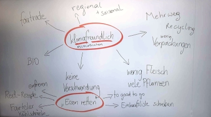 Ernährung und Klimaschutz sind eng miteinander verbunden. Beim Workshop standen verschiedene Fragen im Mittelpunkt, z. B. welche Auswirkungen unsere Einkaufsgewohnheiten auf das Klima haben, etwa beim Kauf von Obst mit langen Transportwegen. In einem Comic-Storyboard konnten die Teilnehmer*innen ihren eigenen nachhaltigen Teller zeichnen.