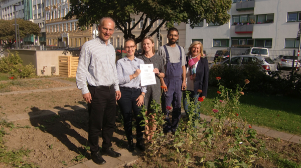 Bildtext: Überreichung der PUMA-Schulen Auszeichnung im Schulgarten der Wissenswerkstatt W178, PUMA-Programmleiter Mag. Dominik Schreiber, Umweltkoordinatorin Verena Lintner, Schulleiterin Karin Zunzer BEd., Schulwart René Fritzer, Fachinspektorin Dipl.-Päd.in Claudia Canaris (v.l.n.r.)